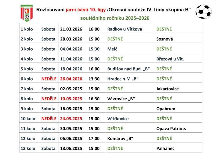TJ Sokol Deštné - rozlosování - jaro 2026