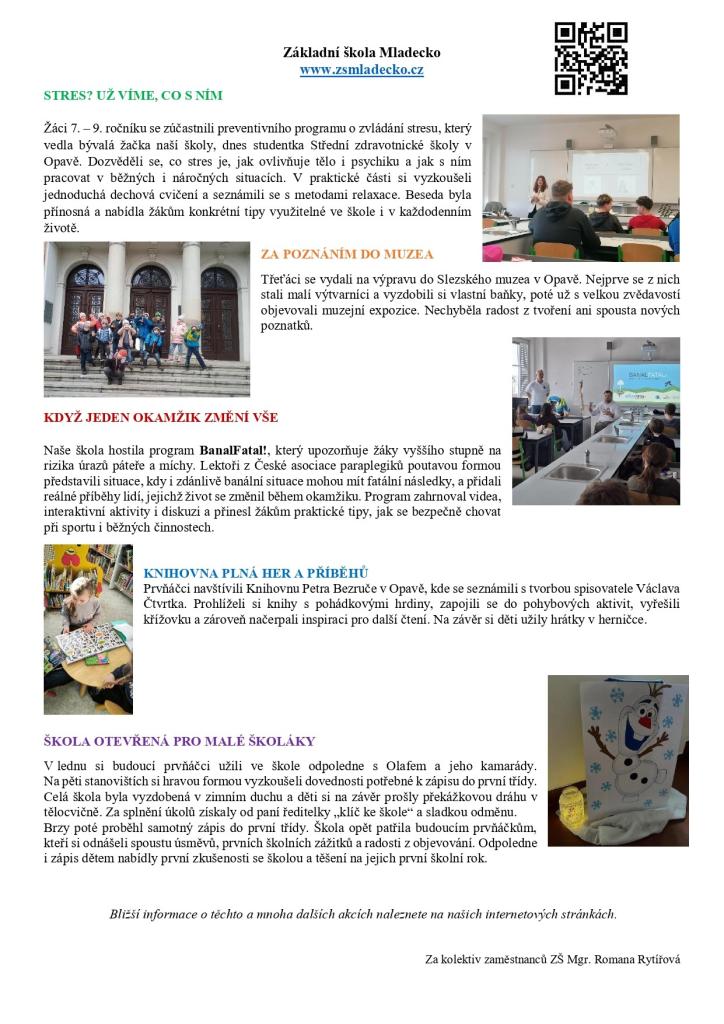 Základní škola Mladecko - informace o uskutečněných akcích - únor 2026